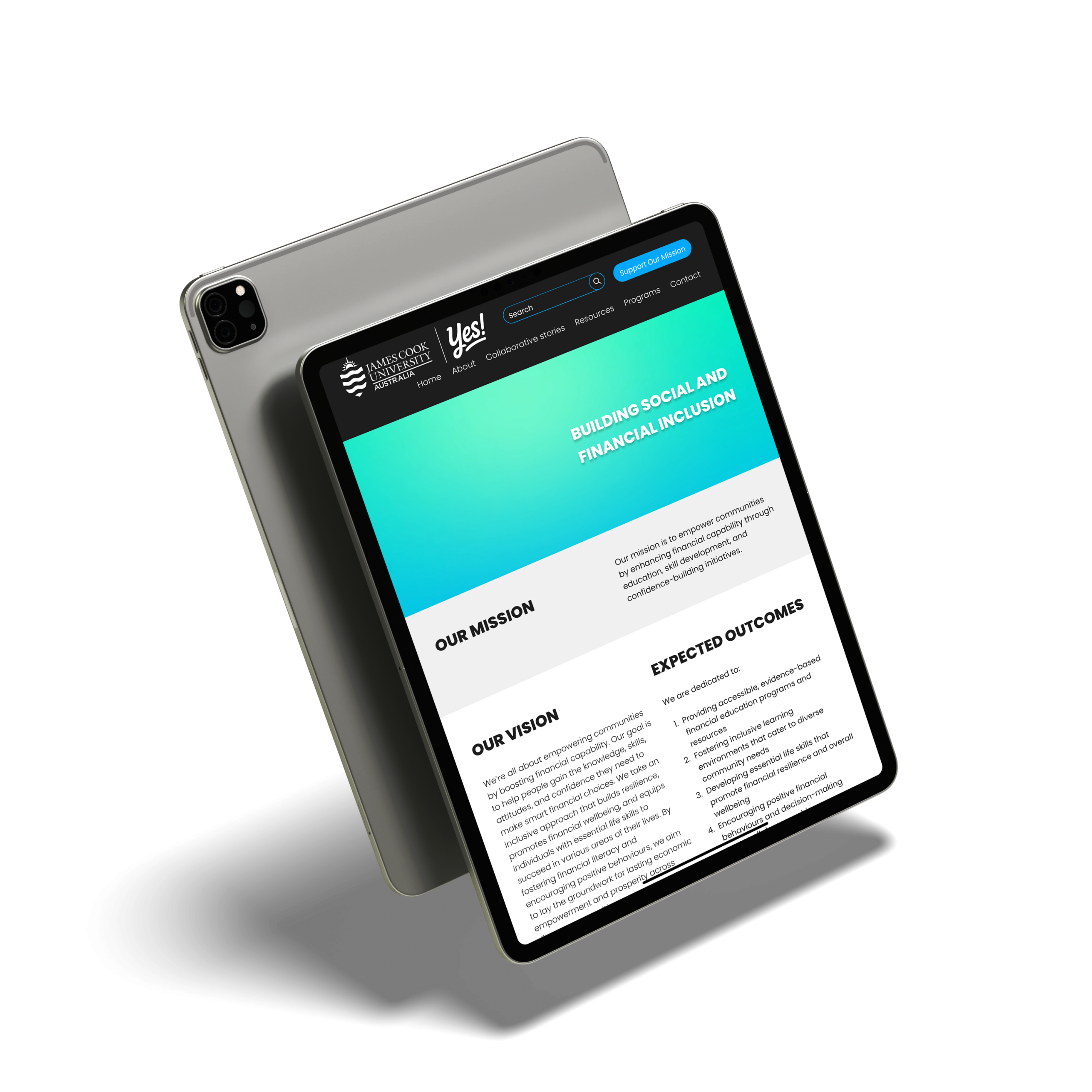 I developed a bold, contemporary brand system centred around the name YES!, leaning into colour, movement, and optimistic language to keep the content accessible and fun. From there, I designed and built a WordPress website with a clear, modular structure that JCU staff can update easily as the program grows. The site houses financial literacy tools, lessons, and downloadable resources, all wrapped in a clean user interface designed to reduce cognitive load and support quick navigation.